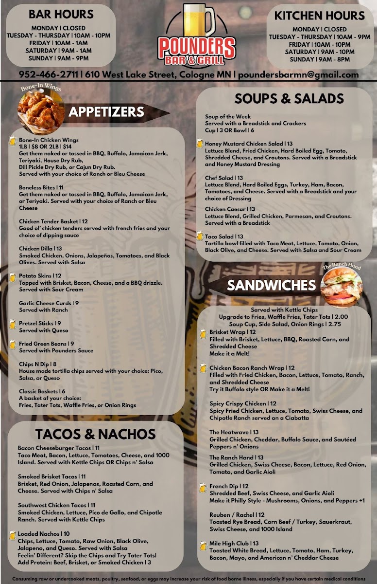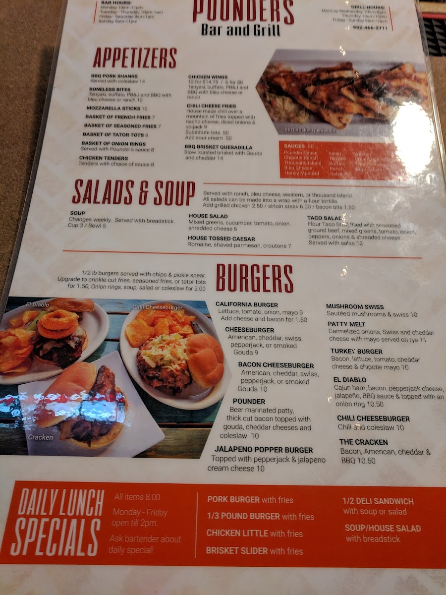 Overall, the food matches the easygoing mood of Pounder's—a place where people come together over solid meals and familiar favorites, accompanied by thoughtful service and a welcoming setting.
