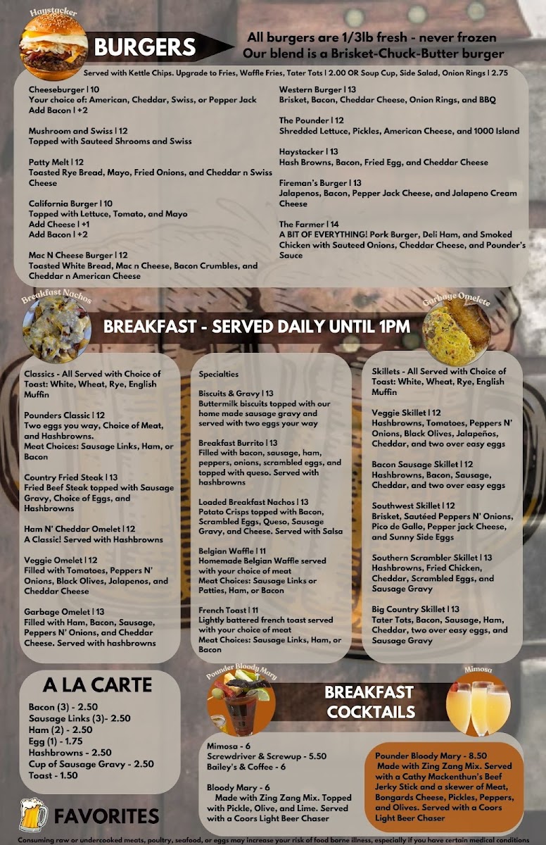 The menu at Pounder's Bar & Grill offers a straightforward, approachable selection that feels right at home in a casual bar and breakfast spot. Whether you're stopping by for a hearty morning meal or settling in for a relaxed lunch or dinner, you’ll find comforting, familiar dishes that pair well with the laid-back atmosphere.